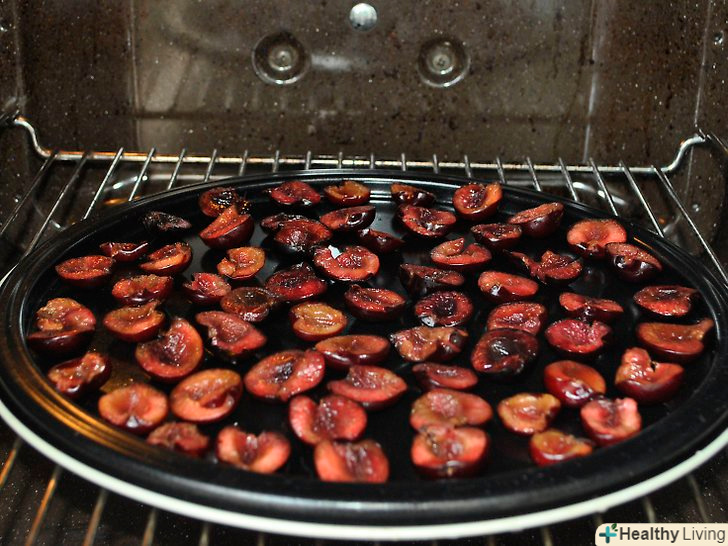 Сушіть вишню протягом 3х годин в розігрітій до 70 градусів Цельсія духовці або дегідраторі.коли ягоди зморщаться, зменшіть температуру до 55 градусів Цельсія і продовжуйте сушити протягом 16-24 годин.