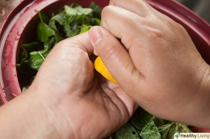 Збризніть лимонним соком.[1] злегка збризніть зелень ріпи лимонним соком і акуратно перемішайте руками, щоб покрити.- Дайте зелені ріпи постояти, принаймні, 5 хвилин. Лимонний сік допомагає активувати в зелені ферменти мірозінази і збільшити утворення ізотіоціанатів. Коротше кажучи, лимонний сік запобігає в'янення зелені, збільшуючи її поживну цінність.