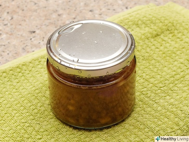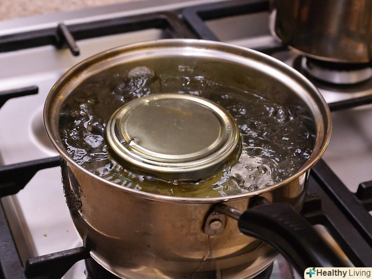 Закрийте банки і простерилизуйте їх. Закрийте банки неостывшими кришками. Поверніть кришку кожної банки за годинниковою стрілкою, щоб кришка щільно трималася на банку, при цьому не затягуйте кришку занадто сильно. За допомогою кухонних щипців для консервування помістіть банки в каструлю з гарячою водою. Вода повинна покривати банки приблизно на 5 сантиметрів. Доведіть воду до кипіння, закрийте каструлю кришкою і кип'ятіть банки протягом 10 хвилин.[11]- Не затягуйте кришки до упору. Вам потрібно, щоб кришка щільно трималася на шийці, проте повітря при нагріванні міг виходити з банки.