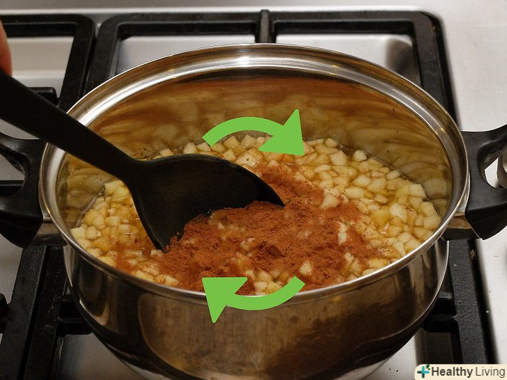 Додайте інші інгредієнти і ретельно перемішайте.додайте в каструлю 2 столові ложки лимонного соку і 50 грамів порошкоподібного пектину. Якщо хочете, можна додати і спеції: по одній чайній ложці меленої кориці і імбиру і мускатний горіх на кінчику ножа. Ретельно перемішайте вміст каструлі, щоб додаткові інгредієнти рівномірно перемішалися з яблуками.[2]- Якщо ви додасте спеції, яблучний джем придбає смак і аромат яблучного пирога. Якщо ж ви віддаєте перевагу смаку яблук без добавок, кориця, імбир і мускатний горіх вам не знадобляться.