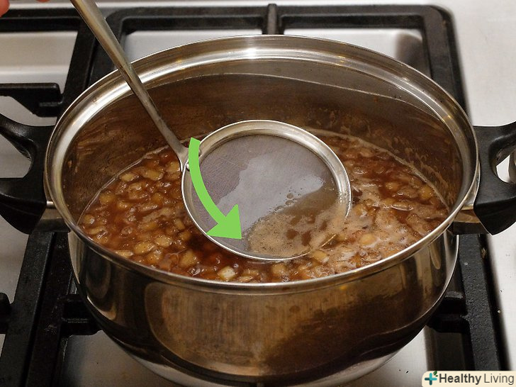 Додайте вершкове масло і зніміть піну.вимкніть вогонь і обережно переставте каструлю з гарячим джемом на холодну конфорку. Додайте в джем половину чайної ложки (2 грами) вершкового масла. Це зменшить кількість піни і додасть джему легкий вершковий смак. Візьміть велику кулінарну ложку і зніміть піну, яка утворилася на поверхні джему. Коли вміст каструлі трохи охолоне, спробуйте джем і додайте спеції на свій смак.[4]- Якщо не прибрати піну, у вашому Джемі утворюються неапетитні згустки і жорсткі грудки.