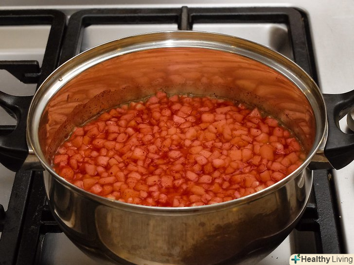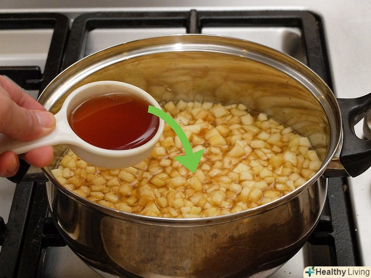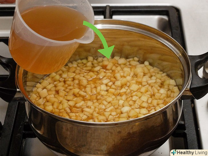 Зніміть з яблук шкірку і наріжте їх.вимийте яблука і зніміть з них шкірку. Видаліть з кожного яблука серцевину разом з хвостиком. Дрібно наріжте яблука, щоб у вас вийшли кубики розміром не більше 5-6 міліметрів. Візьміть велику мірну чашу і пересипте в неї нарізані яблука, потім додайте холодної води до позначки 1000 мл.перелийте воду з шматочками яблук у велику каструлю.[1]- Багато сортів яблук годяться для приготування джему. Ви можете взяти яблука сортів "Кортланд", "Пінк Леді", "Пепін" або "Джонаголд" — з них вийде прекрасний джем. Також спробуйте комбінувати яблука декількох сортів-це зробить ваш джем більш ароматним.