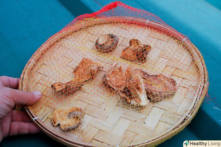Покладіть гриби для сушіння.є два способи: їх можна розкласти на сушарку або нанизати на нитку.[6]- Якщо ви використовуєте сушарку, то розкладіть гриби в один шар. Переконайтеся, що гриби ніде не злиплися і не деформувалися. Накрийте гриби спеціальною сіткою від комах, яку можна знайти в будь-яких господарських магазинах або супермаркетах. Замість сітки також можна використовувати будь-яку сітчасту тканину.[7]