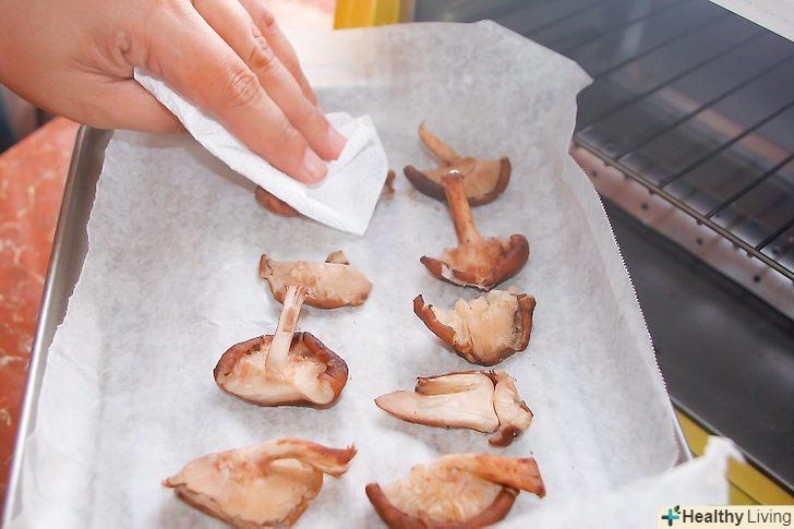 Очистіть гриби, які ви збираєтеся сушити.використовуйте щітку або суху паперову серветку, щоб прибрати бруд з грибів. Взагалі не рекомендується мочити гриби, призначені для сушіння, так як це може викликати зростання цвілі, і гриби будуть зіпсовані. Навіть непомітна цвіль на грибах може стати причиною отруєнь.[1]- Якщо на грибах є якась бруд або плями, які складно прибрати за допомогою серветки, використовуйте вологу губку, щоб зішкребти її, але після цього обов'язково протріть це місце за допомогою сухої серветки, щоб вона ввібрала в себе всю вологу.