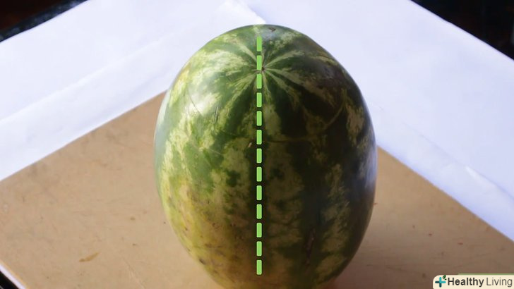 Знайдіть середину кавуна і розріжте по її лінії до нижнього краю фрукта.- Візьміть більший шматок кавуна і поставте його шкіркою вниз, м'якоттю наверх.