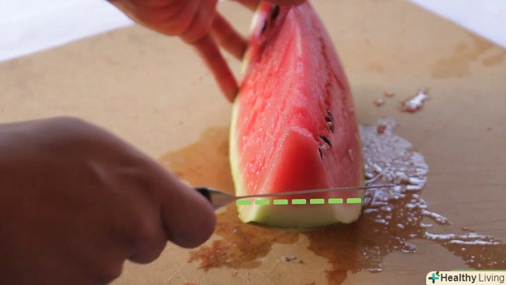 Помийте шкірку кавуна звичайним милом або засобом для миття фруктів і овочів.інакше бруд з шкірки в ході розрізання потрапить всередину кавуна, на його м'якоть.- Гострим ножем обережно зріжте верх і низ кавуна.ніж з зубчиками найкраще підходить для продуктів з жорсткою зовнішньою оболонкою і м'якими нутрощами – диня, помідори, хліб і так далі. Ніж повинен бути довшим, ніж фрукт, який ви хочете розрізати.