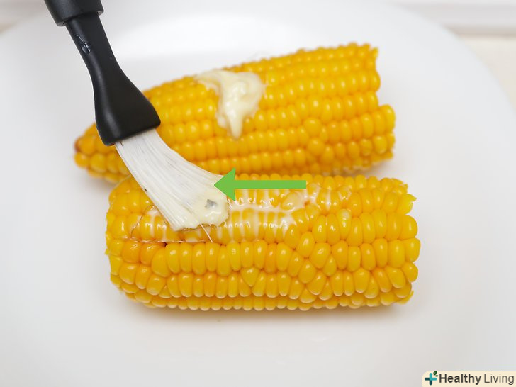 Полийте кукурудзу приготовленою сумішшю з масла безпосередньо перед тим, як подавати її на стіл.щоб масло рівномірно змастило качани, перевертайте їх в блюді за допомогою щипців.[10]