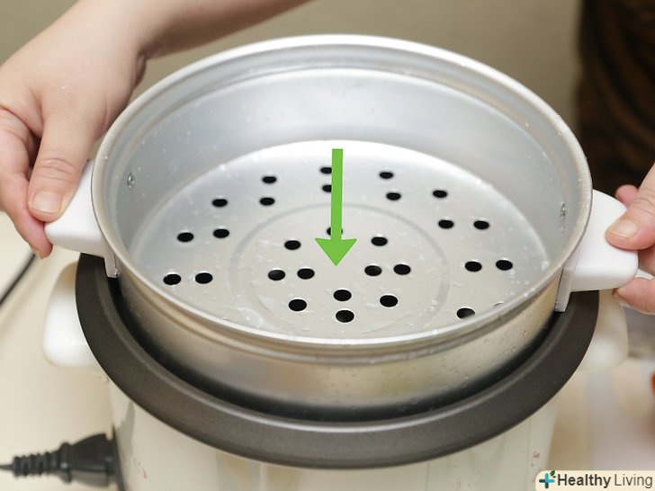 Розмістіть на каструлі кошик для пароварки.При цьому вода не повинна діставати до дна кошика. В іншому випадку вилийте трохи води, але постарайтеся, щоб вона покривала дно каструлі приблизно на 5 сантиметрів. Врахуйте, що вам, можливо, доведеться долити воду, коли кукурудза буде готуватися на пару.