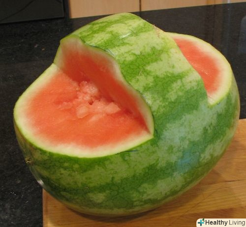 За допомогою довгого тонкого ножа виріжте верхню частину кавуна, залишаючи центр в якості ручки. Збережіть вирізані шматки кавуна.- Після того, як вирізали ручку, виріжте з шкірки півкола, щоб ручка стала хвилястою.