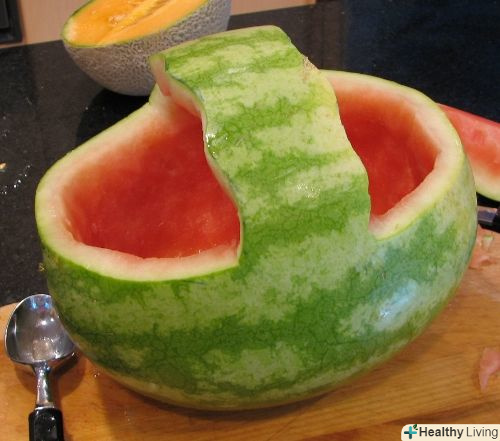 Купіть стиглий кавун.це важливо, оскільки, хоча ви і будете використовувати шкірку для" кошики", внутрішню частину плоду ви теж з'їсте. Якщо кавун перезрілий, то можливо буде важко з ним працювати. Але якщо кавун недозрілий, то салат буде позбавленим смаку.- Якщо у вас є які-небудь сумніви щодо свіжості фруктів, попросіть менеджера місцевого супермаркету допомогти вам вибрати.