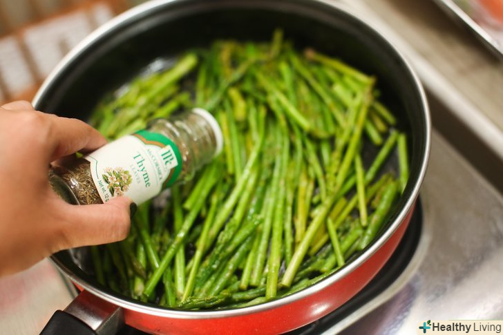 Підсмажте спаржуНа сковорідці.обріжте пагони, полийте їх невеликою кількістю оливкової олії і додайте приправи. Перемішайте пагони і спеції в мисці. Потім, в ідеалі, бажано перекласти спаржу на гарячу сковороду-гриль; плоска сковорода також підходить для цієї мети. Залиште спаржу на середньому вогні, поки вона не потемніє з одного боку (1-2 хвилини). Перемішайте і приготуйте з інших сторін. Подавайте спаржу теплою.
