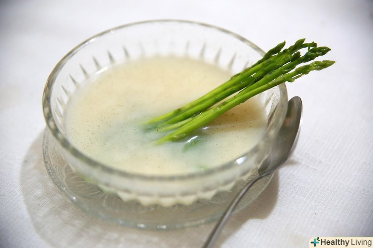 Приготуйте крем-суп з спаржі.Крем-суп з спаржі стане елегантним початком ланчу або обіду; ви можете приготувати цю страву за 50 хвилин. Суп буде досить ситним, щоб стати головною стравою, але також може служити в якості гарніру.[3] щоб подати чотири порції:- Обріжте кінчики 12 пагонів спаржі, 3,5 сантиметра від верхівки, а також розріжте їх навпіл уздовж, якщо пагони товсті. Залиште обрізані кінчики, щоб потім прикрасити суп.