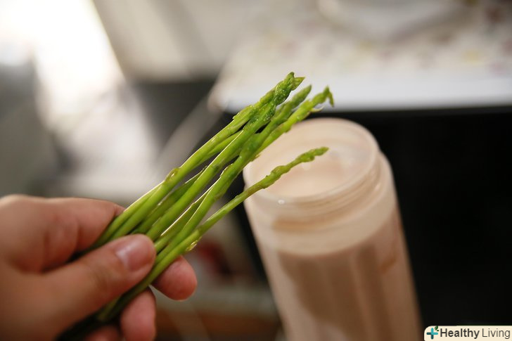 Додайте спаржу в смузі.просто додайте кілька пагонів спаржі в свій фруктовий коктейль. Ви можете додавати подрібнену спаржу в сирому вигляді в смузі або ж просто опустити пагони в стакан.
