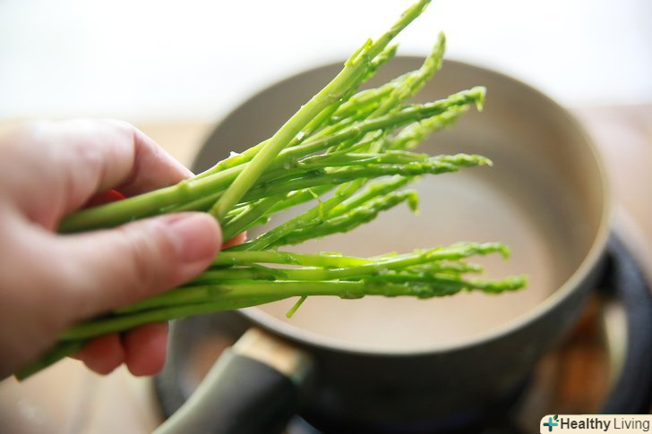 Приготуйте спаржу на пару.обріжте кінці спаржі, якщо пагони занадто товсті. Вимийте спаржу. Налийте у велику каструлю 5 сантиметрів води і поставте в неї пароварку для овочів. Вода не повинна просочуватися крізь отвори пароварки; якщо це станеться, вилийте трохи води з каструлі. Покладіть спаржу в каструлю і доведіть воду до кипіння. Готуйте спаржу на пару до тих пір, поки не отримаєте бажану текстуру.- Ви можете подати спаржу, приготовану на пару, грилі або в обжаренном вигляді в якості гарячого на вечерю. Вона традиційно подається з розплавленим маслом або свіжоприготованим голландським соусом. Її можна їсти виделкою або пальцями.