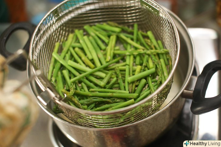 Бланшируйте спаржу.варіть спаржу в каструлі з водою протягом 3-5 хвилин, в залежності від товщини пагонів. Коли пагони придбають яскраво-зелений колір і стануть м'якими, помістіть їх в" крижану ванну": наповніть велику миску на 2/3 холодною водою і кубиками льоду. Ванна з льодом "шокує" спаржу і зупинить процес приготування. Замочіть спаржу на ту кількість часу, яке вона кипіла. За допомогою друшляка або паперового рушника Позбавтеся від зайвої води.- Бланшовану спаржу можна подавати в салатах, або як окрему страву з соусом і приправою. Щоб приготувати просте і смачне блюдо, додайте трохи солі крупного помелу і невелика кількість оливкової олії перед подачею.