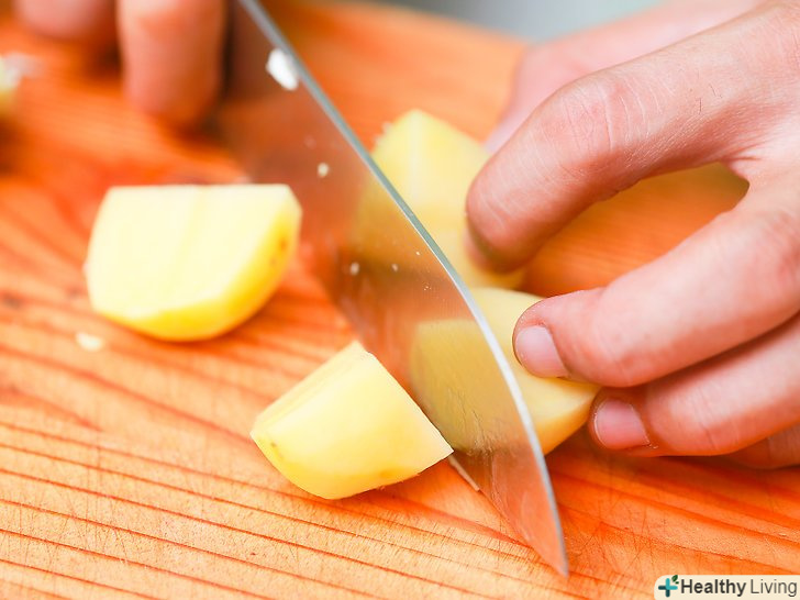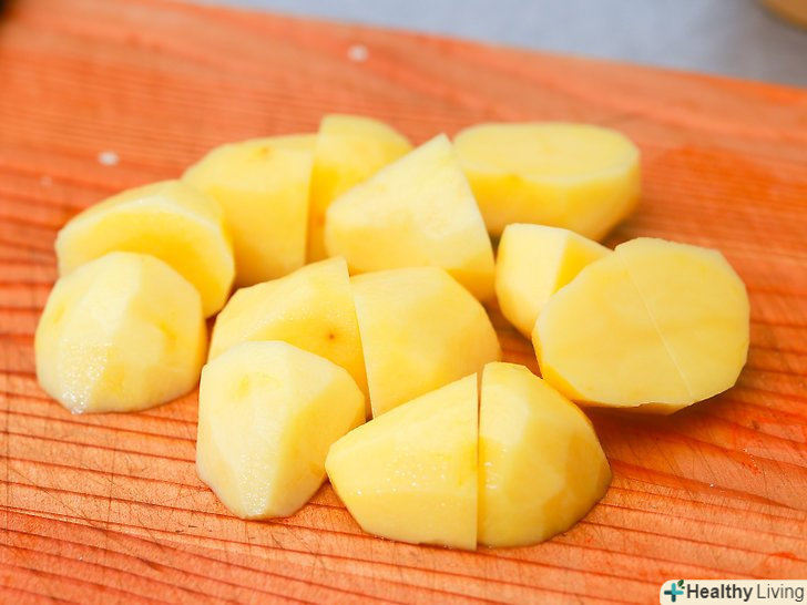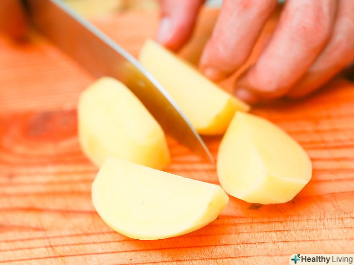 Вимийте, очистіть і наріжте картоплю.очистіть картоплю щіткою для овочів під прохолодною проточною водою і розріжте на 4 частини.- Очистіть шкірку овочевим ножем, перш ніж нарізати картоплю.