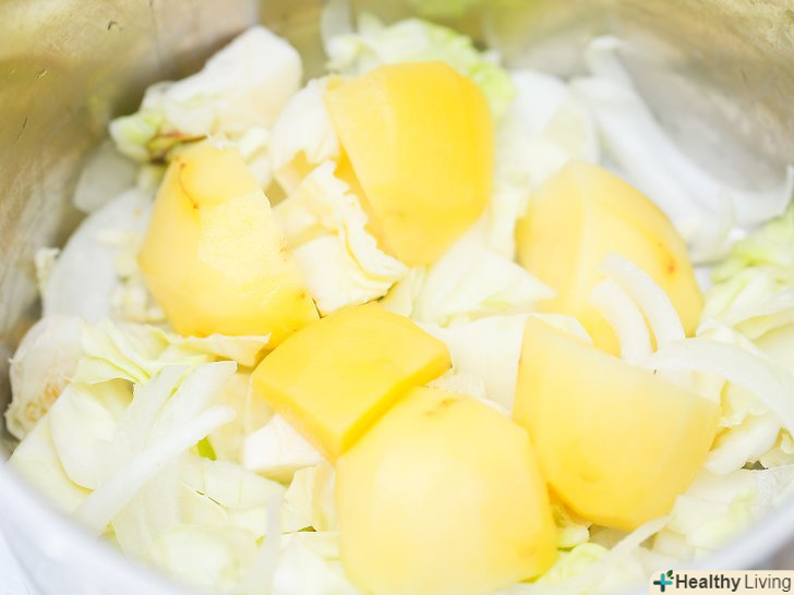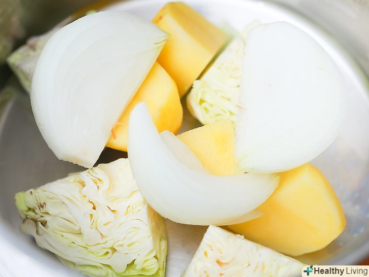 Помістіть картоплю, капусту і шматочки цибулі в каструлю з водою.викладіть овочі в каструлю шарами. Заповніть каструлю водою, щоб їх покрити.- Овочі повинні бути занурені під воду, по крайней мере, на 2,5 см.у процесі приготування можна додати ще води.