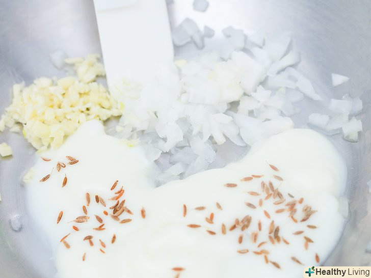 Змішайте насіння, цибулю, часник, сіль і йогурт.після того, як кмин охолоне протягом пари хвилин, перекладіть його в маленьку миску. Додайте цибулю, часник, сіль і йогурт і перемішайте до однорідної маси.