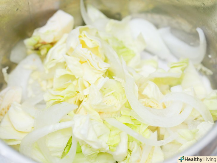 Перемішайте в каструлі повільного приготування капусту, цибулю, часник і насіння гірчиці.додайте ці інгредієнти в каструлю повільного приготування і перемішайте.- Ви можете покрити каструлю повільного приготування жиром для готування (спреєм) або використовувати спеціальну підстилку, перш ніж додати овочі. В іншому випадку, капуста або цибуля можуть прилипнути до дна або стінок каструлі.