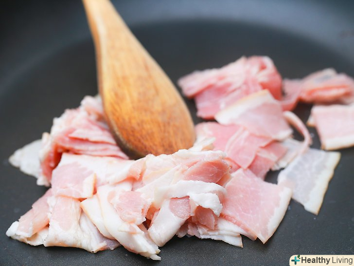 Обсмажте бекон в середній сковороді протягом 7 хвилин.приготуйте бекон на середньому вогні, періодично помішуючи.- У беконі багато жиру, тому не потрібно додавати масло при смаженні.