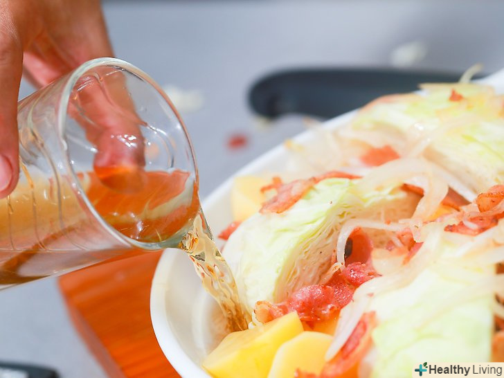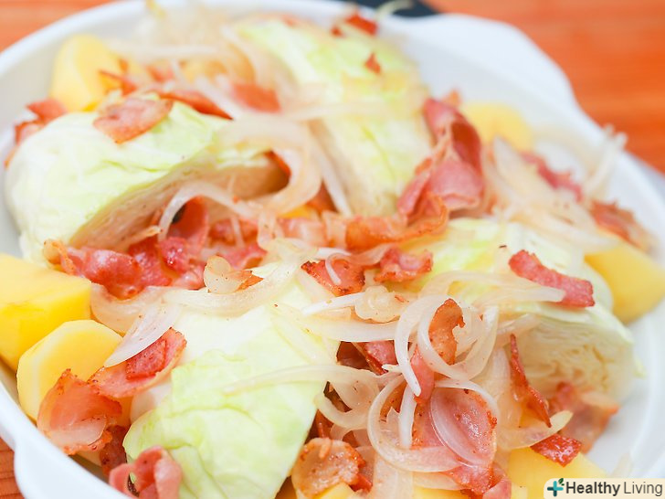 Викладіть вміст сковороди на картоплю і капусту.перекладіть цибулю, бекон і масло на деко якомога більш рівномірно.- Не зливайте жир перед додаванням бекону на сковороду. Жир слід додати разом з іншим вмістом сковороди.