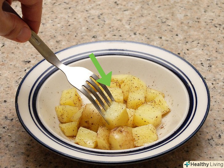 Перевірте готовність картоплі.через п'ять хвилин після початку приготування дістаньте картоплю з печі і перевірте, чи готовий він. Проколіть кубик виделкою-якщо картопля м'яка і зубці вилки легко входять в м'якоть, картопля готова. Якщо шматочки все ще тверді, значить, вони ще не готові. Продовжуйте готувати картоплю ще хвилину, потім повторіть перевірку і так до тих пір, поки картопля не стане м'яким.