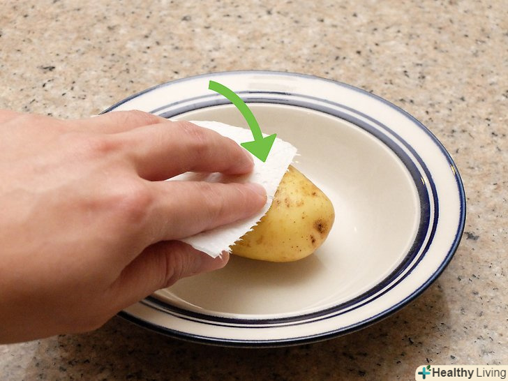 Виберіть бульба картоплі і вимийте його.для запікання в мікрохвильовій печі найкраще підійдуть сорти з високим вмістом крохмалю, такі як" Рів'єра "або"Беллароза". Якщо немає можливості дізнатися сорт картоплі, візьміть той, де на упаковці вказано "для варіння". Виберіть Бульба масою близько 150 грамів і ретельно вимийте його за допомогою щітки, щоб видалити бруд з поверхні. Ви будете запікати картоплю в шкірці, так що бульба повинна бути чистою. Сполосніть картопля і обсушити його.[1]- Якщо на шкірці є плями або нерівності, виріжте їх кухонним ножем.