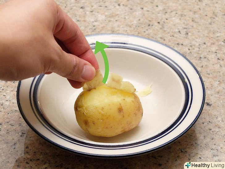 Очистіть картоплю від шкірки.одягніть прихватку або візьміть кухонні щипці і дістаньте картоплину з посуду, в якій вона готувалася. Охолодіть Бульба під струменем холодної води протягом 15 секунд. Зробіть надріз на одній стороні бульби і акуратно зніміть шкірку цілком.[12]