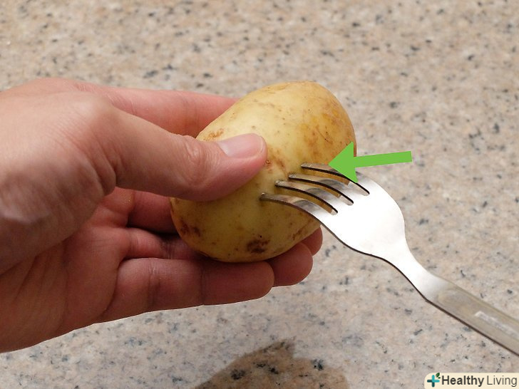 Надколіть картоплю.візьміть вилку і проколіть по 4-5 отворів з кожного боку бульби. Ці отвори необхідні, щоб пар вільно виходив з бульби під час приготування. Якщо не надколоти Бульба, він може вибухнути в мікрохвильовій печі. Покладіть картоплю в тарілку або інший посуд, безпечну для використання в мікрохвильовці.[2]