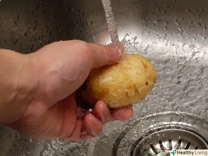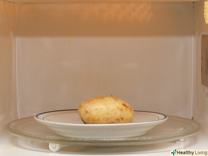 Ретельно вимийте і обсушити великий бульба картоплі.ретельно вимийте картоплину за допомогою щітки і обсушити Бульба. Помістіть Бульба в мікрохвильову піч. Шкірка картоплі повинна бути цілою, тому не потрібно ні надкаливать картопля, ні знімати з нього шкірку.[10]- Вам потрібно взяти картоплину з товстою шкіркою і високим вмістом крохмалю. Найкраще для ваших цілей підійде картопля сорту "Рів'єра", але можна також взяти і іншу картоплю, наприклад, популярного сорту"Ред Скарлет". Якщо хочете, можете взяти для цих цілей навіть солодка картопля-батат.