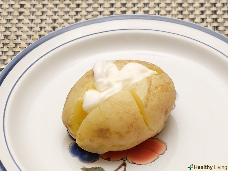Гарніруйте картоплю.коли картопля буде готова, зробіть розріз гострим ножем у верхній частині бульби. Складіть кілька разів паперовий рушник і помісіть поверх розрізу. Іншою рукою натисніть зверху, щоб шкірка картоплі розкрилася. Злегка розімніть м'якоть виделкою і покладіть добавки за своїм вибором, наприклад:[5]- Сметану;