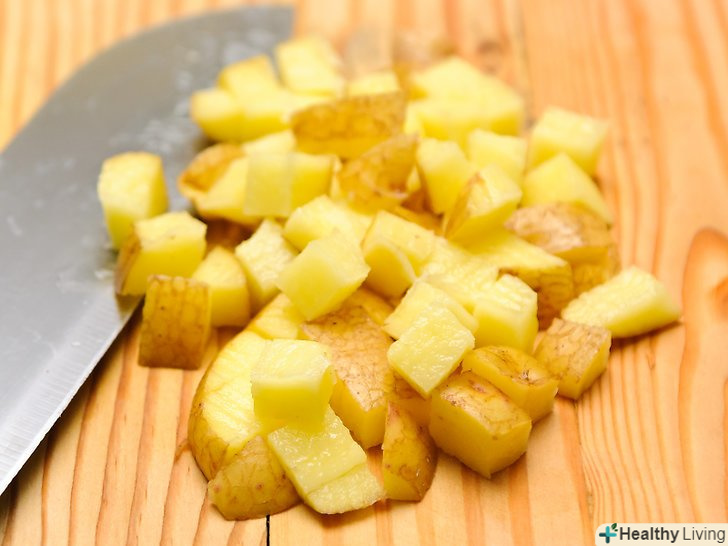 Виберіть картоплю.щоб приготувати картоплю шматочками, вам буде потрібно картоплина середнього або великого розміру. Віддавайте перевагу сортам картоплі з високим або середнім вмістом крохмалю, наприклад, "Беллароза" або "Каратоп". Якщо немає можливості дізнатися сорт картоплі, візьміть той, де на упаковці вказано "для варіння". Ретельно вимийте Бульба щіткою, сполосніть і обсушити паперовим рушником.[6]