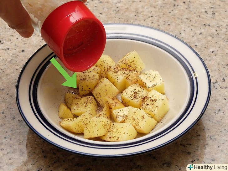 Додайте приправи.збризніть шматочки картоплі оливковою олією (на це буде потрібно приблизно столова ложка масла). Посипте картоплю приправами за своїм вибором, наприклад, сіллю і чорним меленим перцем, готовою приправою для страв з картоплі, орегано або часниковим порошком. Перемішайте картоплю, щоб масло і приправи покривали всі кубики рівномірно.[8]
