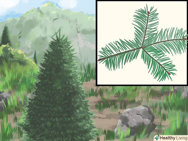 Навчіться визначати дерева, такі як болиголов і ялина Дугласа.лисички, як правило, ростуть біля коріння цих дерев. Якщо на землі багато трави або якщо є багато опалого листя (а не хвої), ви, ймовірно, не знайдете лисички в безпосередній близькості.- На цьому малюнку показана гілка ялинки Дугласа.