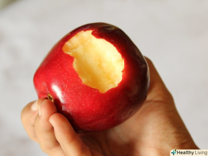 З'їжте яблуко цілком.мабуть, найбільш поширений спосіб їсти яблука полягає в тому, щоб кусати і їсти м'якоть сирого яблука разом зі шкіркою, обертаючи його і відкушуючи черговий ласий шматок. Якщо у яблука є стебло, відкрутіть і викиньте його. Зазвичай яблуко об'їдають до самої твердої і схожою на пластмасу серцевини, в якій міститься кілька насіння, а потім викидають її.[9]- Всупереч поширеній думці, серцевина яблука цілком їстівна. За деякими оцінками, в серцевині міститься близько 30% їстівної м'якоті кожного яблука. Спробуйте з'їсти яблуко разом з нею і почніть при цьому з нижнього кінця (місця цвітіння).