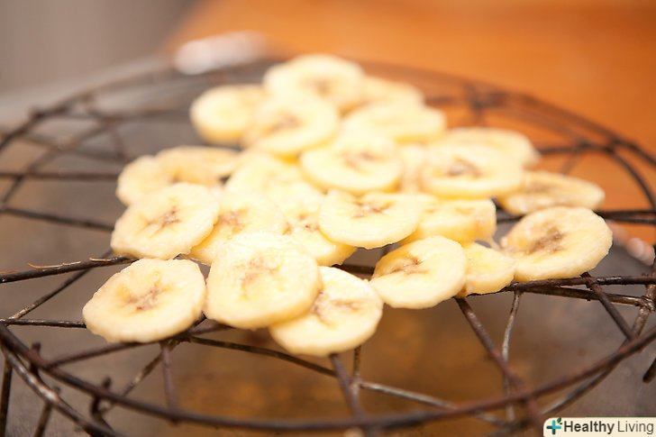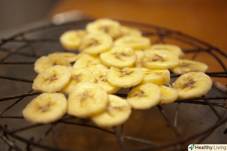 Покладіть банани в сушарку.- Можете покласти шматочки банана на один з лотків сушарки і встановити її на 60 ºС, якщо у вас вона є.