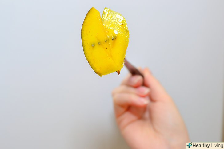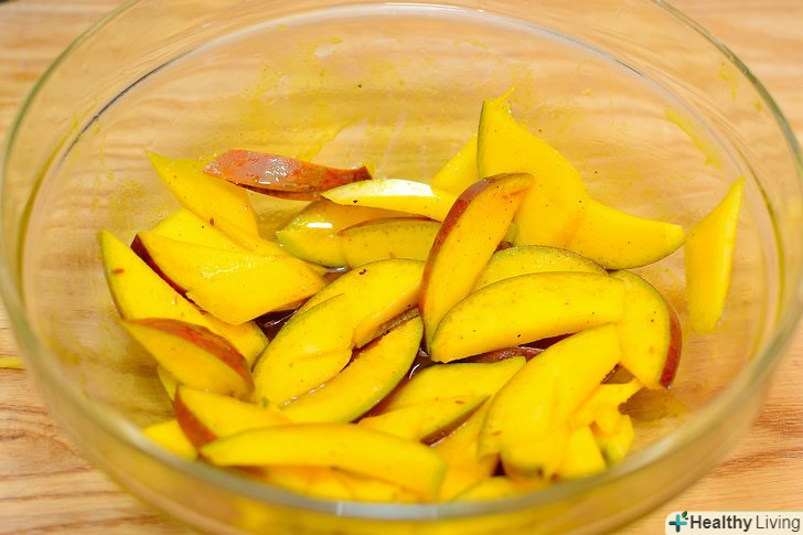 Змішайте суміш спецій з манго.ретельно змішайте суміш спецій з шматочками манго, таким чином, щоб вони добре вкрилися. Якщо не хочете забруднити руки, надіньте рукавички. Можна насипати суміш в миску і вмочати кожен шматочок манго, переконавшись, що покриваєте обидві сторони.