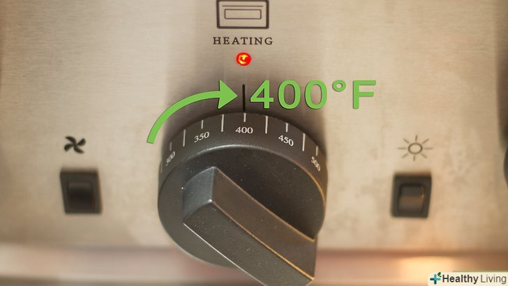 Розігрійте духовку до 200 °C. Увімкніть духовку і виставте потрібну температуру. Духовка подасть звуковий сигнал, коли температура досягне потрібної позначки.[9]- Якщо у вашій духовці немає індикатора готовності, просто розігрівайте духовку 15 хвилин.