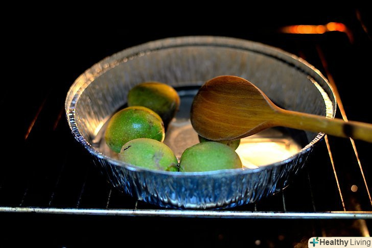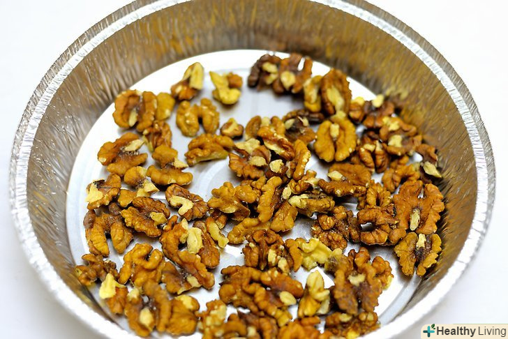 Витягніть волоські горіхи з шкаралупи.в ідеалі очищені волоські горіхи будуть розділені на половинки або четвертинки. Цілі волоські горіхи прожаряться не рівномірно, в той час як шматочки менше, ніж четвертинки можуть занадто смажиться і в результаті згоріти. Щоб волоські горіхи рівномірно приготувалися, розкладіть їх в один шар.
