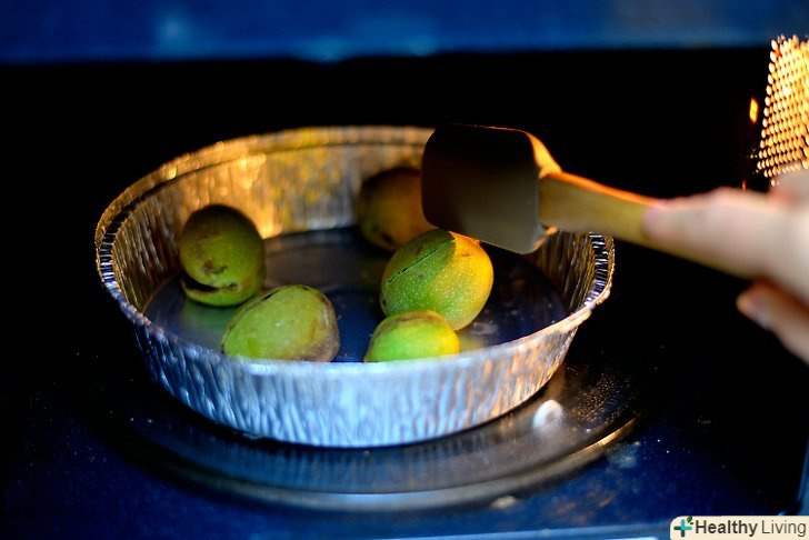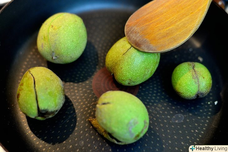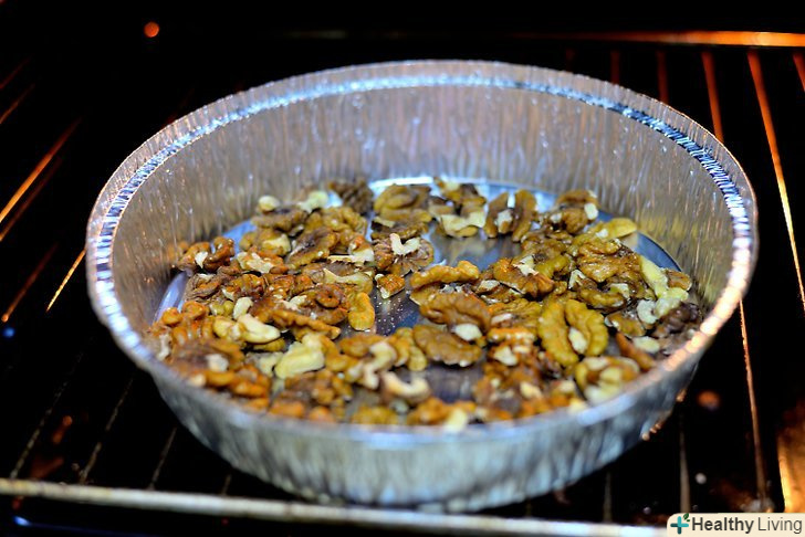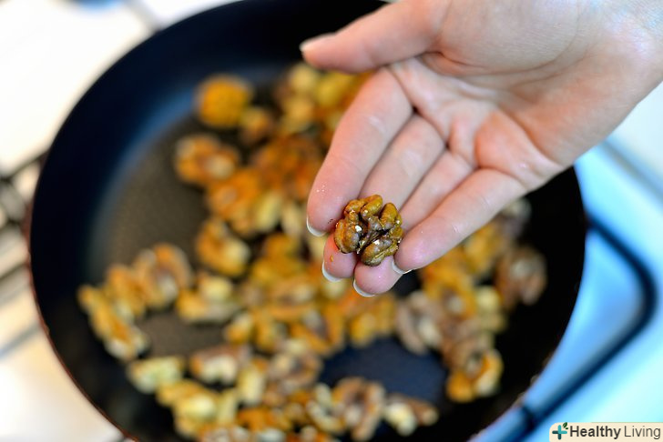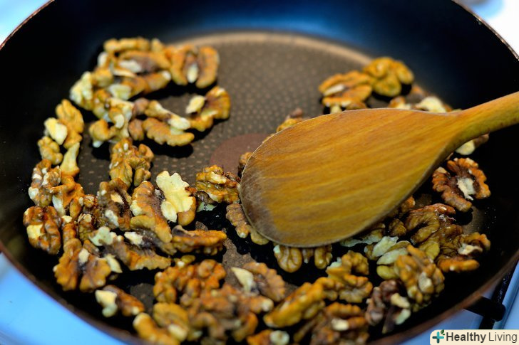 Нагрійте велику неглибоку сковороду.поставте сковороду на плиту і нагрійте її на середньому вогні. Використовуйте тільки сухе тепло, так як жиру і масла в волоських горіхах досить для їх смаження. Тому немає необхідності використовувати антипригарний спрей, рослинне або вершкове масло.