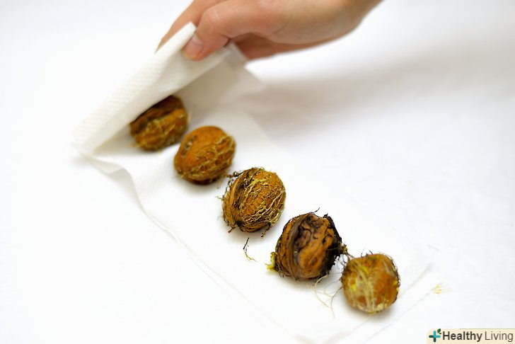 Протріть волоські горіхи рушником. [3] використовуйте чистий кухонний рушник або паперову серветку. Не сильно, але різко проведіть рушником по горіхах, щоб видалити з них гірку шкірку.