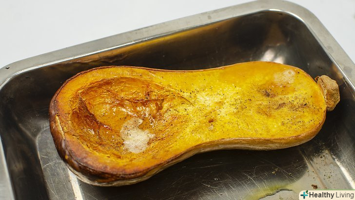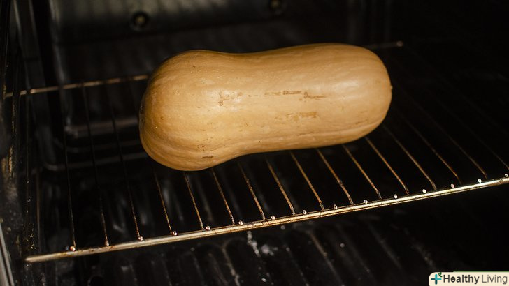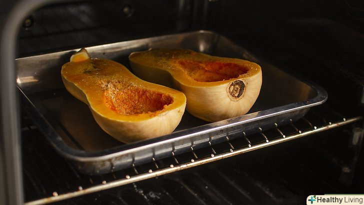 Запечіть гарбуз цілою, якщо хочете скоротити час приготування.якщо ви не хочете різати тверду гарбуз, то спочатку запечіть її, щоб потім її було простіше розрізати. Металевим шампуром виконайте в гарбузі кілька отворів і покладіть її на деко. Запікайте гарбуз 60-70 хвилин при температурі 200 °C. потім обережно розріжте м'яку гарбуз по довжині і видаліть насіння.[9]- Одягніть прихватки і переверніть гарбуз, коли пройде половина часу.