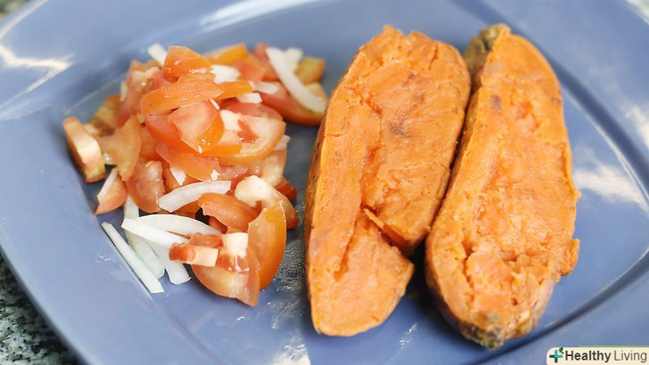 Сервіруйте солодку картоплю.до солодкої картоплі підходять найрізноманітніші гарніри і приправи. Його можна подати з салатом зі свіжих овочів, яблучним соусом або склянкою йогурту. Солодка картопля прекрасно поєднується також з біфштексом, смаженої на грилі курятиною або овочевим рагу!
