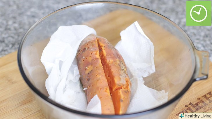 - Якщо ви віддаєте перевагу солодку картоплю з хрусткою скоринкою, можна готувати його в мікрохвильовій печі 5-6 хвилин, а потім зняти паперовий рушник, перекласти на деко і поставити його на 20 хвилин в попередньо розігріту до 200 °C духовку. Даний метод прекрасно підходить в тому випадку, якщо ви хочете отримати картоплю з хрусткою скоринкою, але при цьому тримати його в мікрохвильовій печі в два рази менше![2]