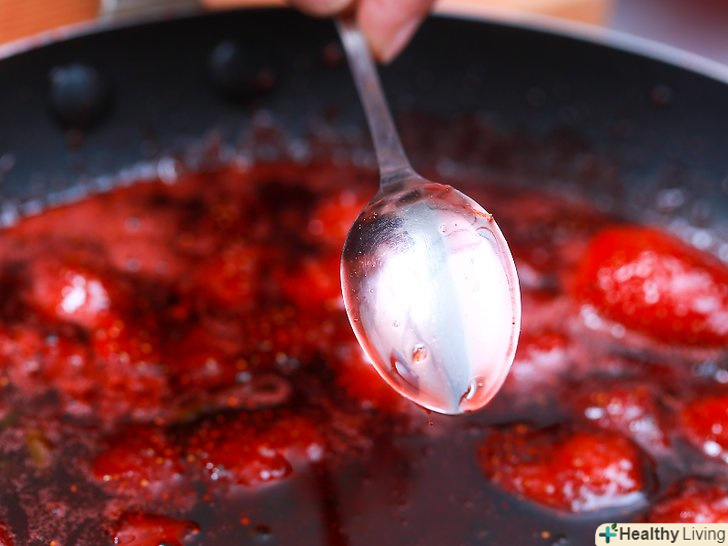 Перевірте, чи стає ваш джем густим чи ні.опустіть ложку в крижану воду на кілька хвилин. Після того як ложка охолоне, зачерпніть «сік» – рідку частину варення – і дайте йому охолодитися до кімнатної температури на ложці. Коли він досягне кімнатної температури, перевірте консистенцію. Якщо він гарненько загус, продовжуйте в тому ж дусі.[3]- Якщо він все ще трохи рідкуватий, додайте чверть пакета пектину і доведіть суміш знову до кипіння ще хвилину.