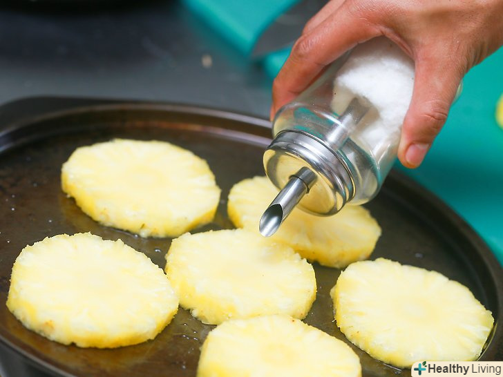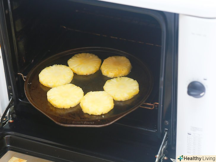 Запечіть шматочки ананаса в духовці.цей спосіб дає такий же ефект, що і запікання на грилі: у вас в підсумку вийде смачний і солодкий ананас. Якщо фрукт дуже твердий і нестиглий, перед запіканням ви можете посипати шматочки ананаса коричневим цукром.