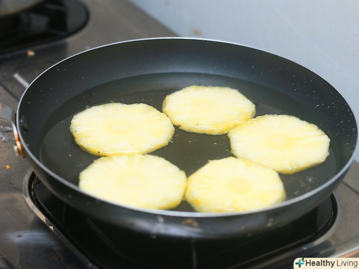 Зваріть шматочки ананаса.і хоча це не допоможе карамелізувати цукор, який міститься в цьому фрукті, варіння допоможе нейтралізувати бромелаїн.[13] спробуйте цей метод, якщо ананас викликає подразнення слизової рота:- Наріжте ананас шматочками і покладіть в каструлю разом з усім соком, який виділився при нарізанні.