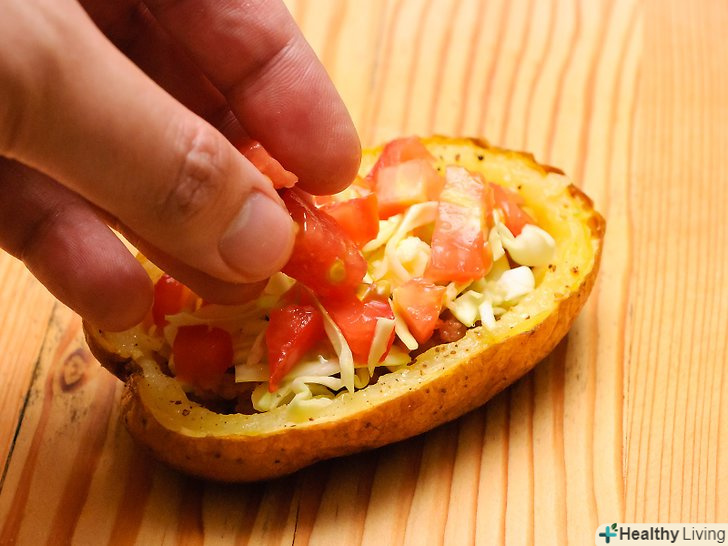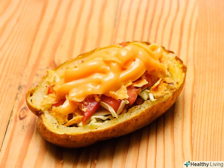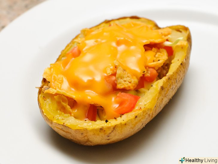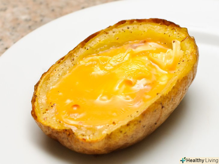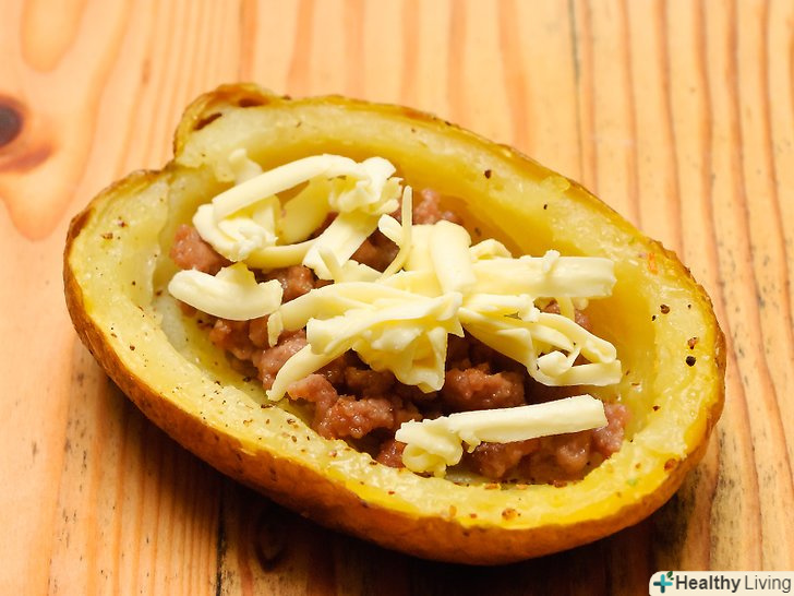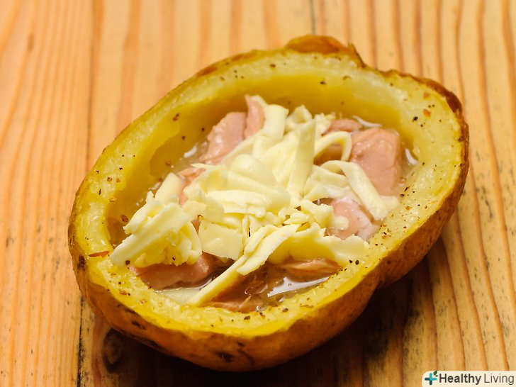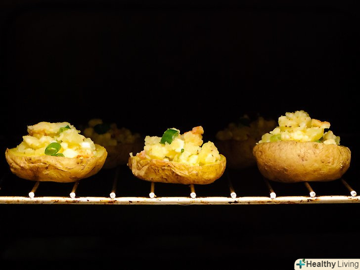Покладіть суміш в шкірку картоплі.випікайте Картопляні шкурки, і їх внутрішній вміст разом, в духовці протягом не менше 20 хвилин. Слідкуйте за вашим блюдом, щоб сир чеддер не підгорів. Коли вони будуть готові, шкірка буде хрусткою і внутрішня частина буде смачною і золотистою.