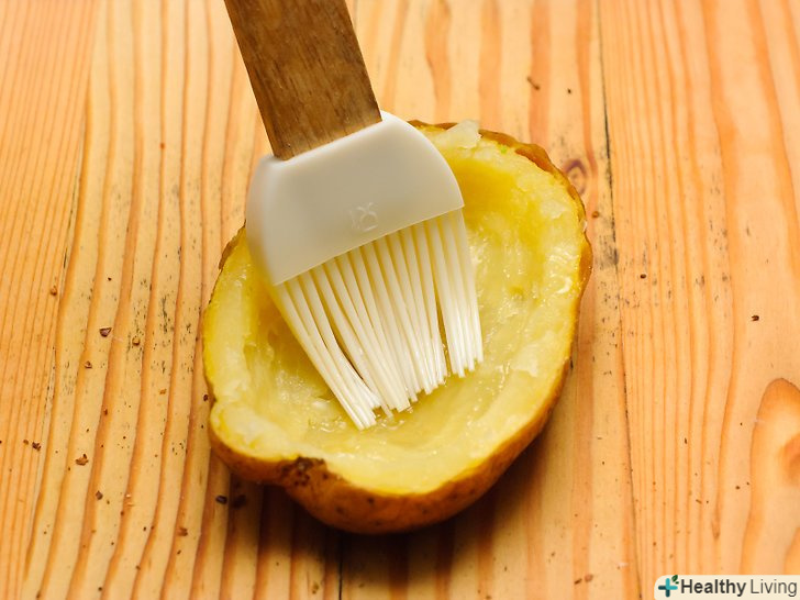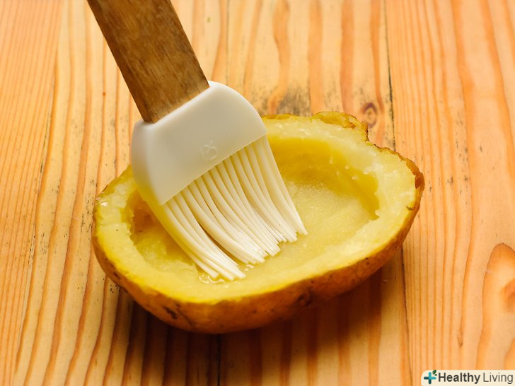 За допомогою кулінарної кисті нанесіть масло по всіх картопляним шкуркам.використовуйте кисть або паперовий рушник, щоб покрити внутрішні і зовнішні сторони шкурки маслом. Це зробить їх більш хрусткими і запобіжить їх від того щоб вони згоріли.
