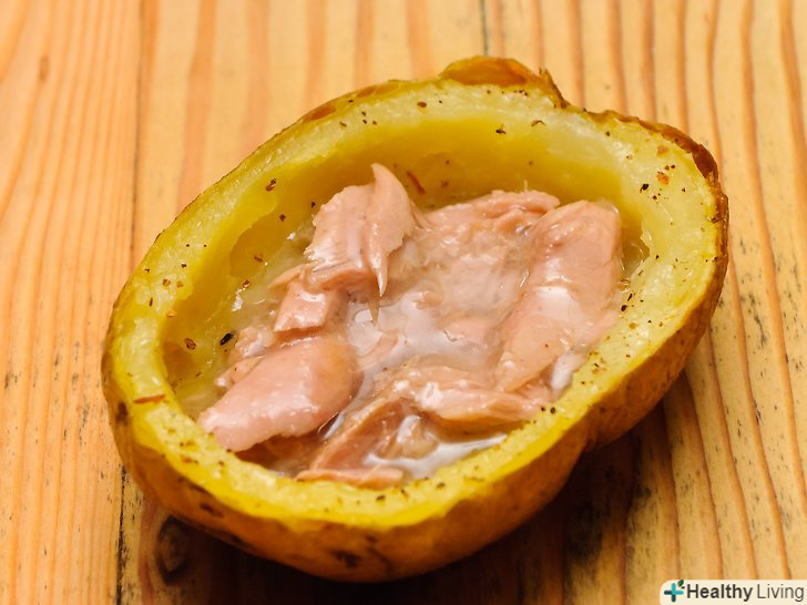 Розподіліть 1 ½ чашки салату з тунця рівномірно по шкірці картоплі.ви можете зробити це за допомогою ложки.